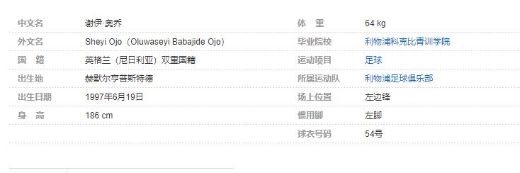 谢伊·奥乔(Sheyi Ojo),1997年6月19日出生于英格兰赫默尔亨普斯特德,英格兰职业足球运动员,司职左边锋,效力于英超的利物浦足球俱乐部。个人简介: