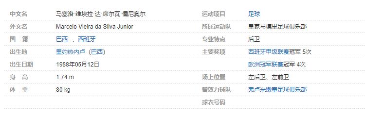 马塞洛·维埃拉·达·席尔瓦·儒尼奥尔(Marcelo Vieira da Silva Junior),1988年5月12日出生于里约热内卢,巴西足球运动员,司职左后卫,现效力于皇家马德里足球俱乐部 ,并担任球队队长 。个人简介