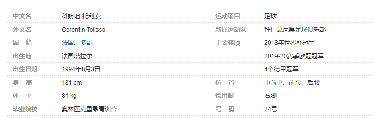 科朗坦·托利索(Corentin Tolisso),1994年8月3日出生于法国塔拉尔,法国足球运动员,司职中场,现效力于德国足球甲级联赛的拜仁慕尼黑足球俱乐部。个人简介
