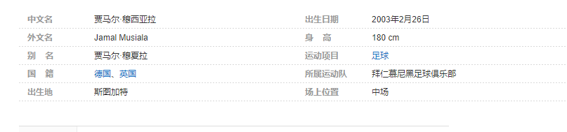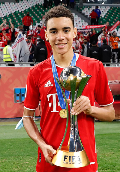 贾马尔·穆西亚拉(Jamal Musiala),2003年2月26日出生于德国斯图加特,德国/英国双国籍足球运动员,场上司职中场,现效力于德国拜仁慕尼黑足球俱乐部。个人简介