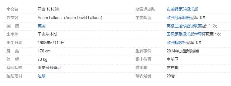 亚当·拉拉纳(Adam Lallana),1988年5月10日出生在圣奥尔本斯,英格兰足球运动员,场上司职中前卫,现效力于英超的布莱顿足球俱乐部。
