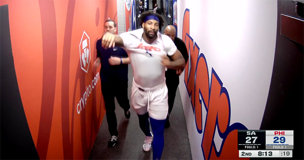 来源:24直播网12-24 10:1124直播网讯北京时间12月24日,NBA常规赛马刺客场大战76人,第二节场上出现争议判罚,庄神连吃两T被驱逐,纳斯怒喷裁判,之后裁判取消庄神的技犯,庄神又从更衣室中回到场上继续比赛;上半场最后阶段,恩比德怒喷裁判连吃两T被驱逐离场。