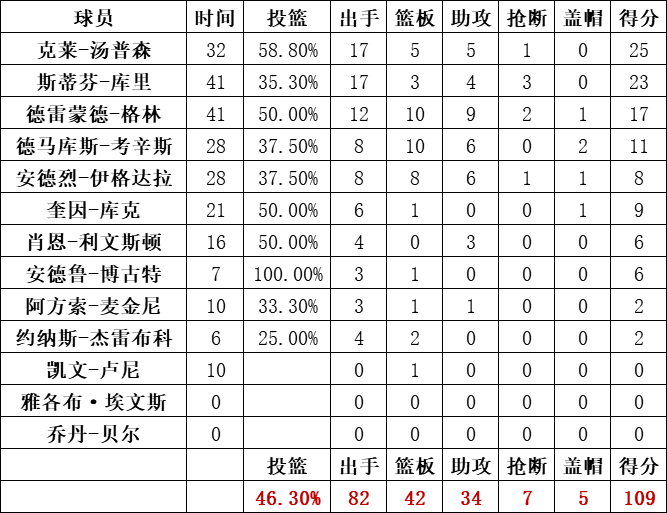 勇士:库里23分3篮板4助攻3抢断,克莱25分5篮板5助攻,德雷蒙德-格林17分10篮板9助攻,考辛斯11分10篮板6助攻,伊格达拉8分8篮板6助攻,库克9分。