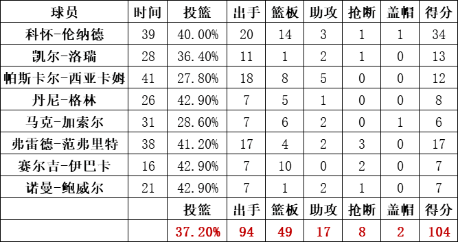 猛龙:莱昂纳德34分14篮板,西亚卡姆12分8篮板5助攻,洛瑞13分2助攻,范弗里特17分4篮板3抢断,伊巴卡7分10篮板,鲍威尔7分2助攻,加索尔6分6篮板。
