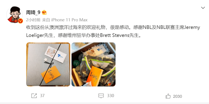 他发文感谢“收到这份从澳洲漂洋过海来的欢迎礼物,很是感动。感谢NBL及NBL联赛主席Jeremy Loeliger先生,感谢维州驻华办事处Brett Stevens先生。”新赛季周琦确定加盟NBL的凤凰队,转战海外联赛,预计会在全运会之后出发启程,这对于他个人以及中国男篮都有重大的意义!