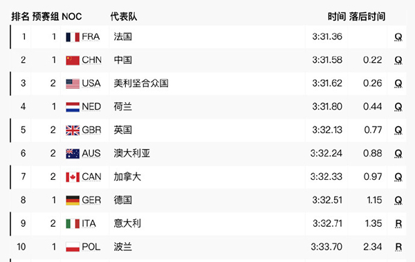 最终,中国男混接力队以总成绩第2的成绩,落后0.22秒,紧随法国之后晋级决赛,决赛中中国队将会位于第5道。此外,美国、英国和澳大利亚等强敌,也都顺利晋级决赛。