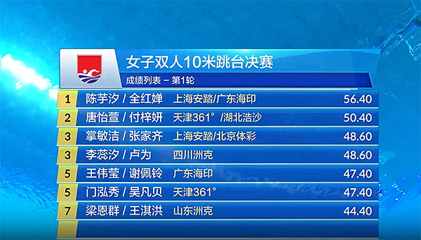 第一轮规定动作201B:全红婵和陈芋汐两人表现出色,动作一致,水花消失术。一名裁判打出10分,三名裁判9.0分,剩下的六名裁判打出9.5分,全红婵和陈芋汐单跳56.40分,排名第一。
