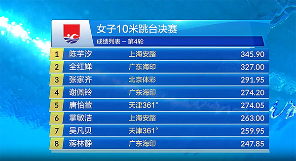 第四轮,全红婵的动作是207C,难度系数3.3,她的表现用完美来形容,4名裁判打出10分,得到95.70分。陈芋汐同样的207C,也表现很好,得到94.05分,总分345.90分,依旧排名第一。