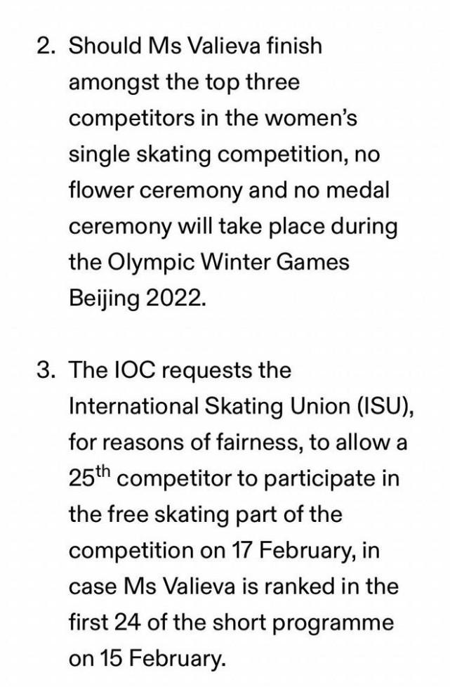 不过尽管CAS允许瓦利耶娃参赛,但她即便夺得金牌,却再没有机会参加颁奖典礼了。14日下午,国际奥委会发布声明,表示将彻底取消团体赛颁奖典礼,同时如果瓦利耶娃最终位列女单前三,那么奥委会届时也将取消女单的颁奖仪式。