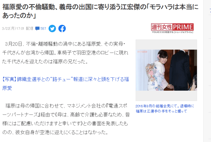 来源:24直播网03-23 10:5624直播网3月23日讯 ,日本媒体《女性周刊》发表一篇评论文章。文章的标题是:福原爱事件中,护送丈母娘回国的江宏杰真的有“情感暴力”吗?在文章中,作者为江宏杰“鸣冤”,称从种种迹象来看,江宏杰不太像会用言语暴力来对待福原爱的人。此外,作者也分析可能是异域的生活,以及对于婚姻太理想化,让福原爱的婚后生活并不甜蜜。