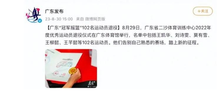 2023年8月29日,广东二沙体育训练中心举行了年度优秀运动员退役仪式,在这一次退役仪式上,一共有来自17个不同项目的102名运动员集体告别了自己的赛场生涯,他们也将开启新的征程,而在这份102人的大名单中,球迷们也看到了熟悉的国乒老将刘诗雯的名字。
