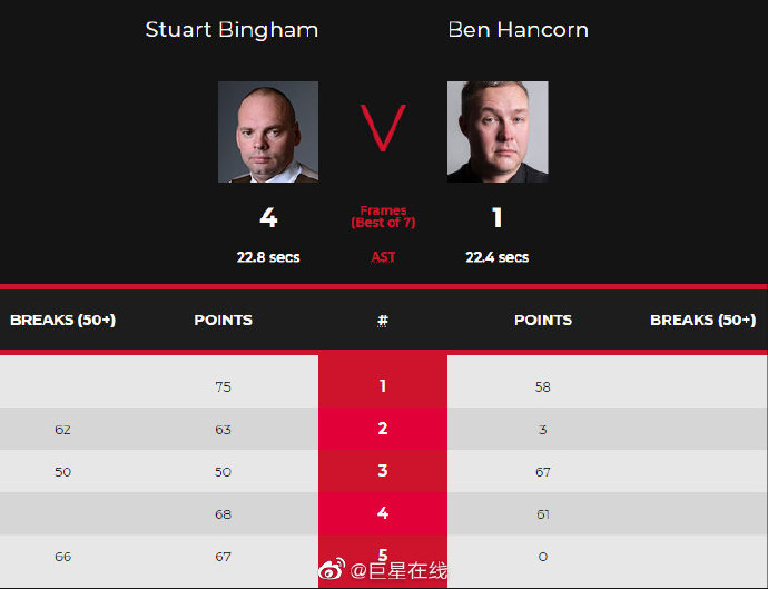 由于在前一天麦克席尔出局让世界前16的球员又少了一人。宾汉姆对于冲击北爱尔兰公开赛正赛也是更加渴望。上赛季宾汉姆没能打破冠军荒。宾汉姆上一次夺冠,还是2020年的大师赛。如今宾汉姆再次出发已经45岁的她仍然是宝刀未老。在延期资格赛对手是大黑马汉克恩,曾经在上赛季淘汰过墨菲这样的优秀学员。前三局比赛两个人打成2:1。然而在第四局和第五局比赛中比汉姆还是发挥出了自己精准的技术最终是4:1横扫,强势打进正赛。