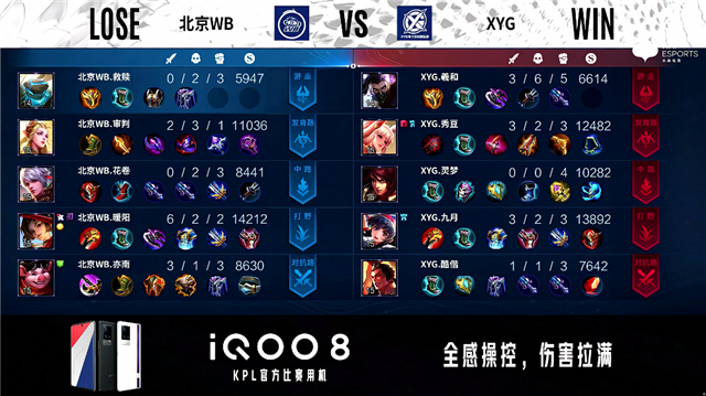 2分01秒,北京WB嬴政击杀越塔的鲁班七号拿下一血。2分40秒,北京WB控下暴君。4分32秒, XYG破掉北京WB下一塔。5分35秒,中路团,双方1换1。6分35秒,北京WB破掉XYG中一塔。7分25秒,北京WB破掉XYG上一塔。7分58秒,XYG越塔击杀马超,随后破掉北京WB上二塔。9分45秒,XYG控下先知主宰。10分钟,中路团,双方团,北京WB打出2换3,马超拿下双杀。11分39秒,A掉控下暗影暴君,随后北京WB马超破掉XYG上二塔。13分23秒,XYG控下暗影主宰。15分45秒,XYG破掉北京WB下二塔。16分17秒,XYG姜子牙大闪抢到暗影暴君,随后双方团战1换1。17分01秒,XYG破掉北京WB中一塔。17分45秒,XYG控下暗影主宰。16分10秒,XYG击杀马超。16分42秒,XYG上路包抄击杀北京WB下路双人组。19分25秒,XYG破掉北京WB上高地及中二塔。20分20秒,中路团,北京WB打出1换2。20分57秒,北京WB控下风暴龙王,团战打出0换2并破掉XYG中高地。21分35秒,北京WB团灭对手后摧毁XYG水晶扳回一城。