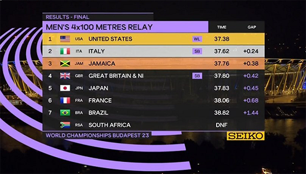 这场比赛的过程一波三折,第一二棒之后,美国队占据明显的领先优势,但之后的交接棒有些失误和小瑕疵,导致美国队在最后一棒时优势没有,与三大对手几乎是并驾齐驱。好在美国队依靠着速度优势强吃,最终以37秒38夺得冠军。