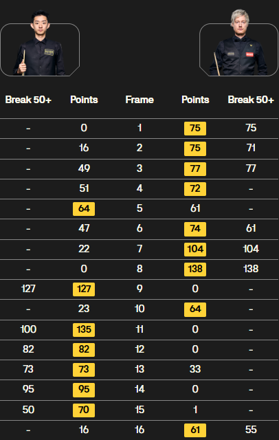 罗伯逊表现:罗伯逊在比赛开始后便迅速进入状态,连续打出单杆75分、71分、77分、61分、104分和138分等高分,展现出强大的进攻实力。他凭借出色的长台成功率和精准的击球,迅速建立了领先优势。
