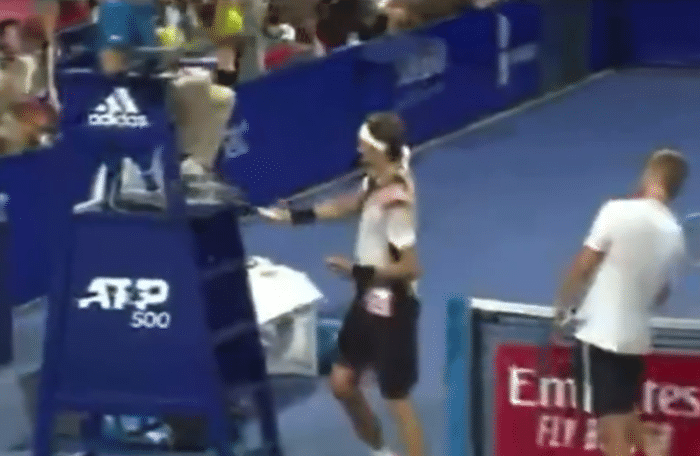 裁判显然有些被吓到了,他下意识地收脚躲避。而小兹维列夫还十不依不饶,连续击打了裁判席3次。而在坐下来之后,小兹维列夫似乎还不解气,又一次站起来和裁判理论,并且再次挥拍击打裁判席。