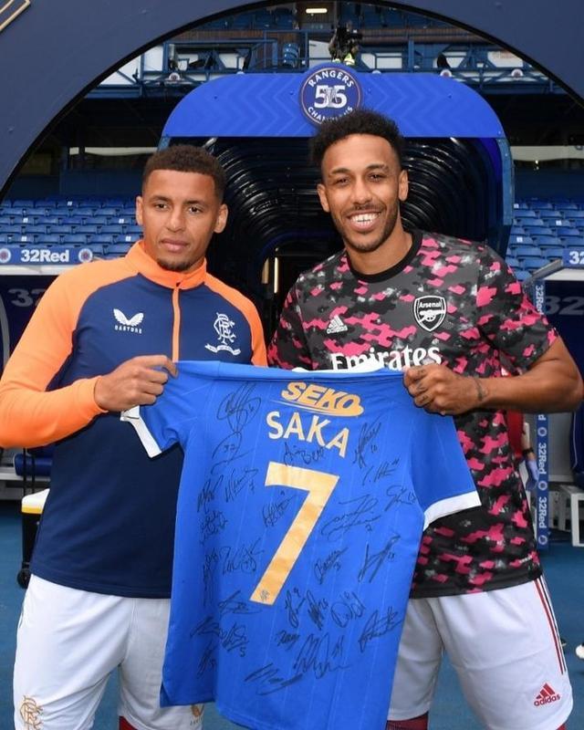 赛前,阿森纳官方推特晒出图片,枪手队长奥巴梅扬和流浪者队长塔维尼耶共同举起了流浪者为萨卡准备的球衣,向萨卡表示了支持。