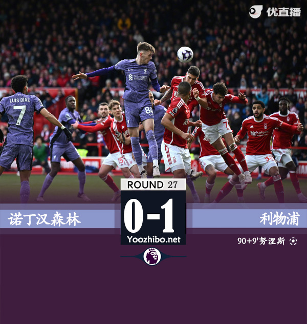 24直播网讯 北京时间3月2日23:00,2023-24赛季英超联赛第27轮,利物浦客战诺丁汉森林。上半场伊兰加失单刀,利物浦控球率超7成,但8次射门0射正,两队暂0-0战平;下半场,复出替补登场的努涅斯补时阶段读秒绝杀,最终利物浦1-0诺丁汉森林,先赛1场暂时4分领跑积分榜。