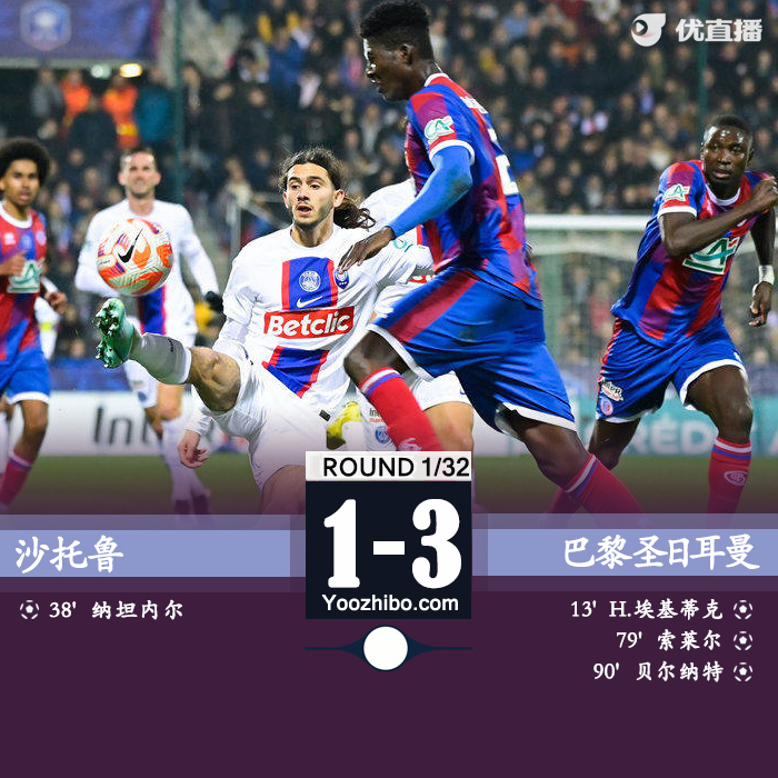 24直播网讯北京时间1月7日凌晨4:00,法国杯1/32决赛,沙托鲁对阵巴黎圣日耳曼。上半场,加尔比助攻埃基蒂克破门,恩托拉扳平比分。下半场,索莱尔破门再次为巴黎取得领先!巴黎圣日耳曼3-1沙托鲁晋级下一轮!