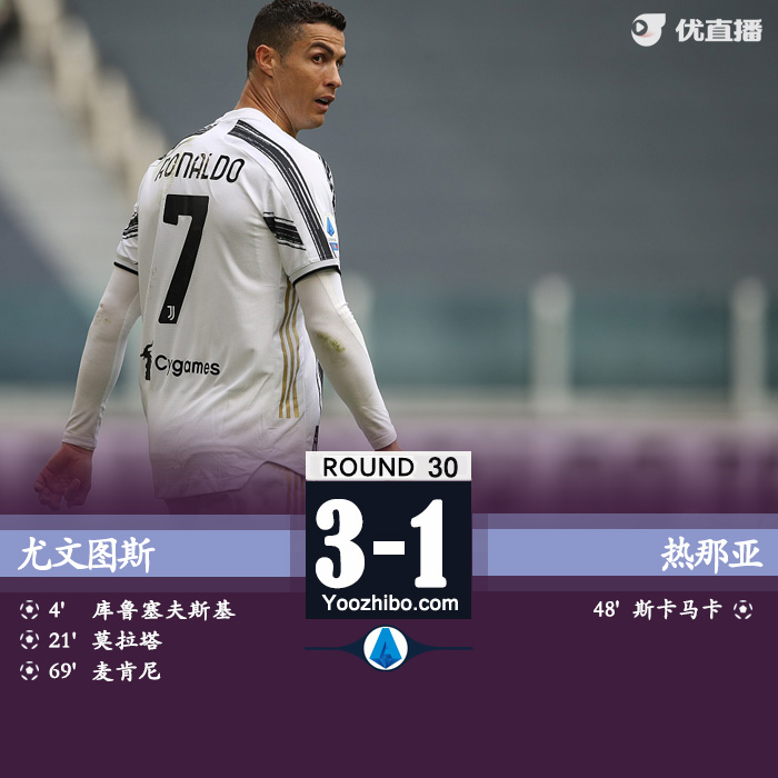 24直播网4月11日讯 北京时间4月11日晚21点,意甲第30轮比赛继续进行,尤文图斯坐镇主场迎战热那亚。上半场,库卢塞夫斯基首开记录,C罗补射中柱,莫拉塔破门;下半场,斯卡玛卡头槌扳回一城,麦肯尼打进单刀球。最终,尤文主场3-1战胜热那亚,积分达到62分,落后身前的AC米兰1分,仍然位列第三。