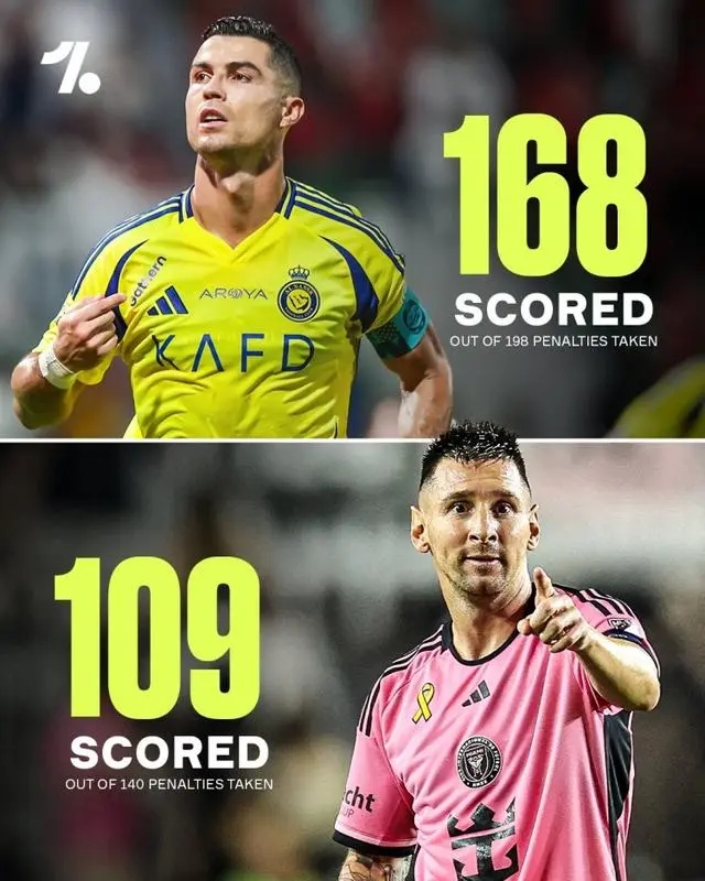 要OneFootball对比C罗、梅西职业生涯至今的罚点数据,C罗成功率更高。