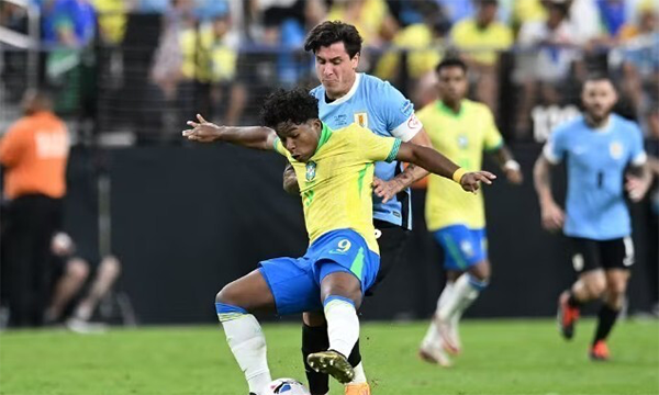 来源:24直播网07-07 16:4024直播网讯 在北京时间7月7日结束的美洲杯最后1场1/4决赛中,“五星”巴西在常规时间多打1人情况下,0-0被乌拉圭逼平,点球大战中,巴西2-4不敌乌拉圭,遗憾无缘4强,创下近3届美洲杯最差战绩。而本场比赛,被寄予厚望的17岁“新大罗”恩德里克的表现令人相当失望。