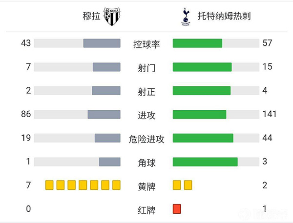 第32分钟,热刺丢球又被迫以10人应战!塞塞尼翁在铲球时动作过大,被主裁判直接出示了红牌!热刺比分落后,人数也落后了!第72分钟,凯恩为热刺扳平比分!凯恩右路禁区内,在门将还未出击时,轻轻一挑,为球队扳平了比分!热刺1-1慕拉!