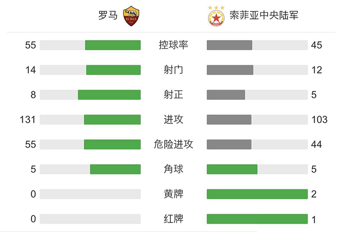 最终全场比赛结束,罗马5-1逆转战胜索菲亚中央陆军。