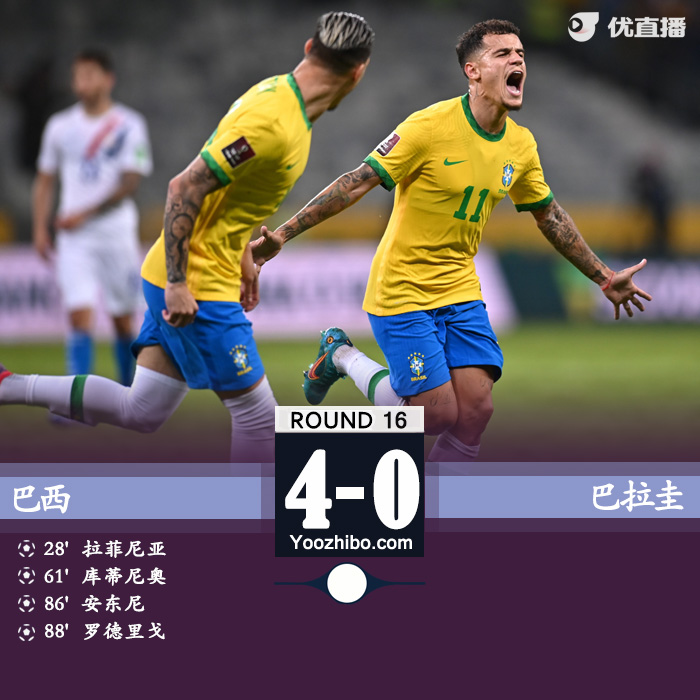 24直播网2月2日讯 北京时间2月2日8:30,卡塔尔世界杯南美预选赛第16轮巴西主场迎战巴拉圭的比赛。上半场拉菲尼亚闪击被吹后低射破门,半场战罢,巴西1-0巴拉圭。下半场拉菲尼亚中柱,库蒂尼奥远射世界波破门,安东尼、罗德里戈替补再进两球,最终巴西4-0大胜巴拉圭保持不败。