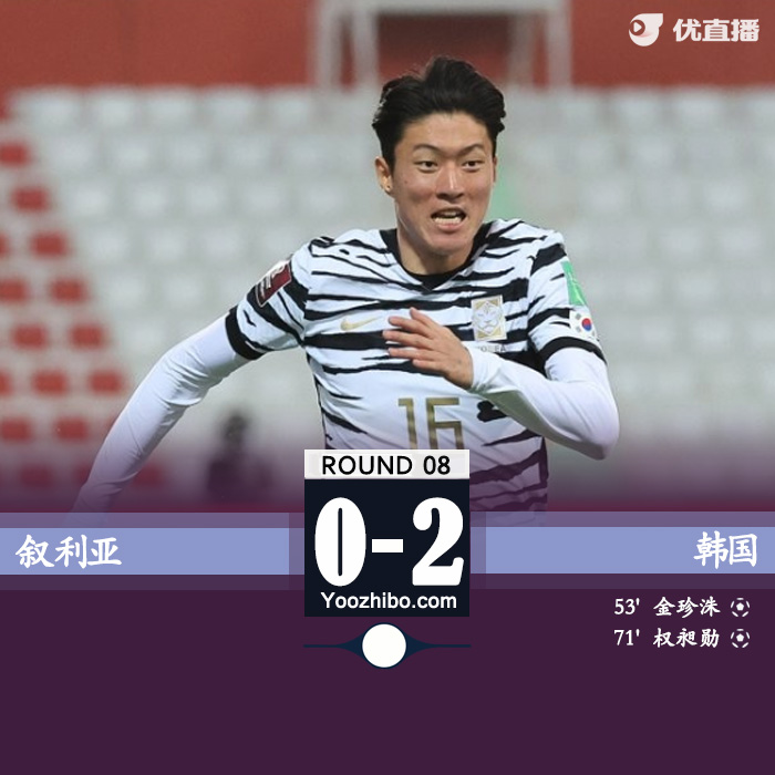 24直播网2月1日讯 北京时间2月1日22:00,世界杯亚洲区预选赛12强赛A组第8轮,韩国对阵叙利亚。上半场,赫里宾头球破门但越位在先,金珍洙险些失误送礼,两队均未进球;下半场,金珍洙头球破门打破僵局,权昌勋世界波锁定胜局。最终,韩国2-0击败叙利亚,提前2轮获得世界杯参赛资格。