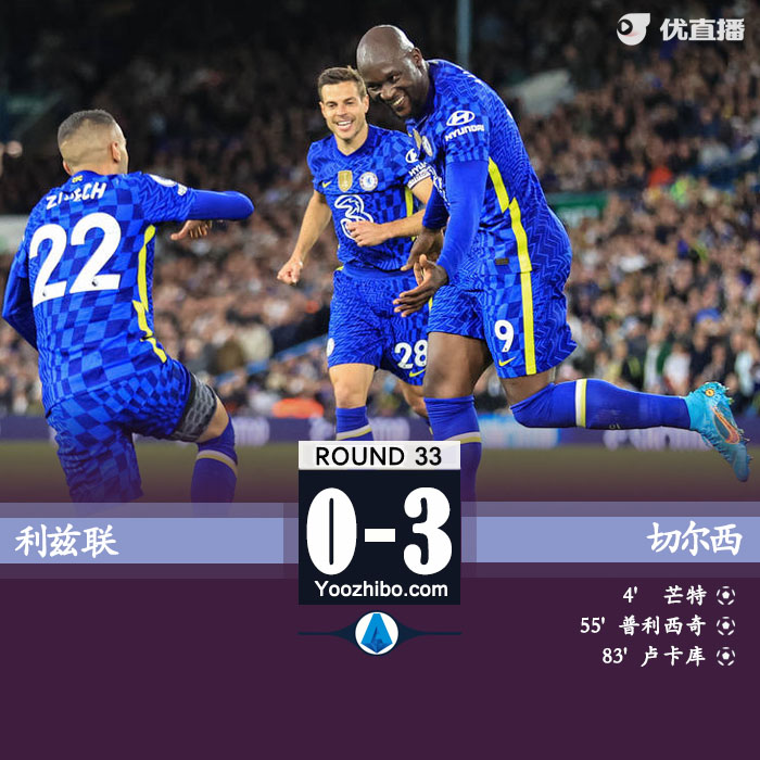 24直播网讯5月12日讯 北京时间5月12日凌晨2点30分,2021-22赛季英超第33轮补赛在埃兰路球场展开角逐,切尔西客场挑战利兹联。上半场芒特首开纪录,丹尼尔-詹姆斯飞铲染红,科瓦西奇伤退,下半场芒特助攻,普利西奇扩大比分,卢卡库1V3破门。最终切尔西客场3-0完胜利兹联,蓝军终结联赛三轮不胜。积分榜方面,切尔西积70分仍居第3,利兹联积34分位列倒数第三。