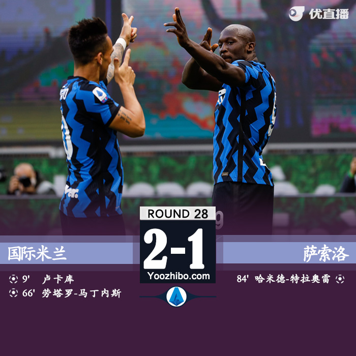 24直播网4月8日讯 北京时间4月8日凌晨0时45分,2020-2021赛季意甲联赛第28轮的一场补赛展开角逐,国际米兰坐镇主场迎战萨索洛。上半场,阿什利-扬助攻卢卡库破门。国米半场1-0领先。下半场,卢卡库送出助攻,劳塔罗-马丁内斯破门,随后特劳雷为萨索洛扳回一城。最终国际米兰主场2-1击败萨索洛。此役结束后,国际米兰取得意甲10连胜,继续排名榜首,领先第二名AC米兰多达11分。