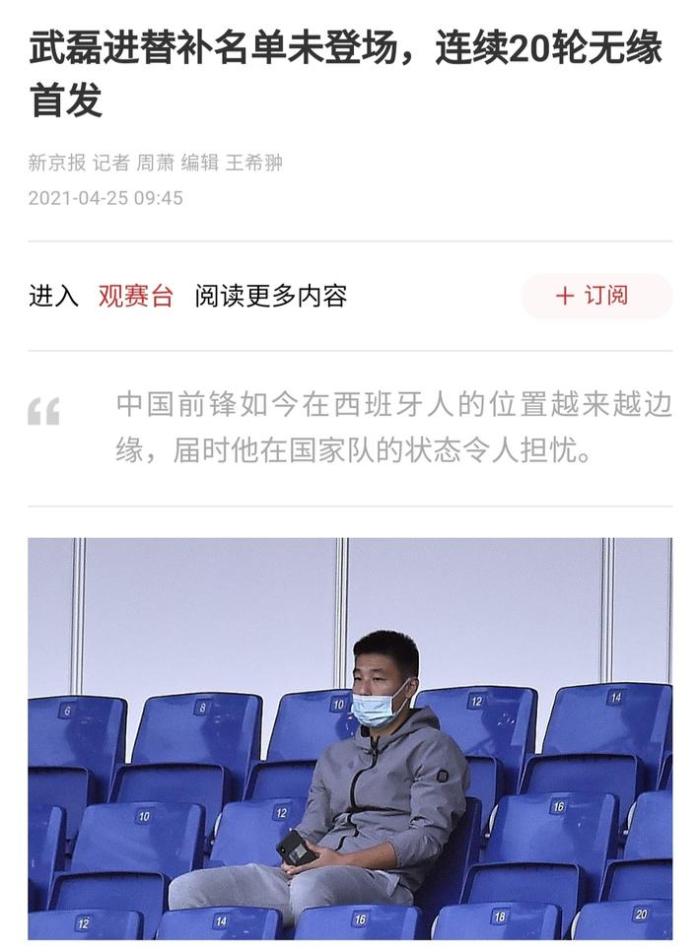 连续20轮比赛未首发, 新京报: 武磊状态让人担忧