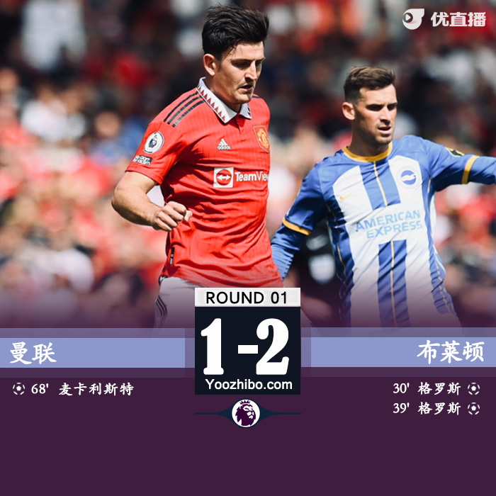 24直播网讯8月7日讯 北京时间8月7日21:00,新赛季英超第1轮,曼联主场迎战布莱顿。上半场,达洛特、弗雷德失误险些送礼,维尔贝克助攻格罗斯破门,格罗斯随后梅开二度;下半场,C罗替补登场,拉什福德错失良机,达洛特造乌龙。最终,曼联1-2布莱顿,滕哈赫遭遇开门黑。