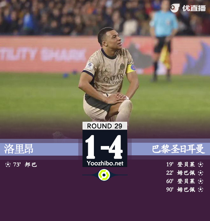 24直播网讯:北京时间4月25日凌晨1:00,法甲第29轮,巴黎客场对阵洛里昂。上半场,登贝莱远射破门;姆巴佩左脚脚后跟建功。下半场,姆巴佩超强过人助攻登贝莱完成双响;邦巴扳回一球;最后阶段姆巴佩再入一球完成双响!最终,巴黎客场4-1击败洛里昂,若随后摩纳哥不胜,将直接夺得本赛季法甲冠军。