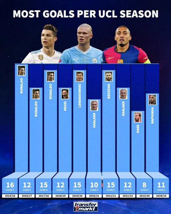 24直播网讯德转盘点了近10年欧冠单赛季最多进球纪录,具体如下: