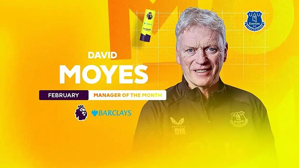 英超官宣:莫耶斯率埃弗顿闪耀2月 荣膺月度最佳主帅