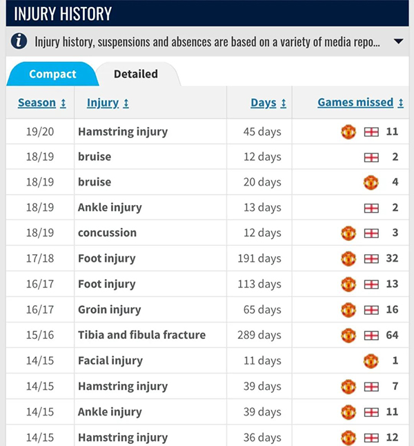 有人将卢克·肖的伤病指向2015/16赛季在欧冠对埃因霍温的断腿意外,但其实并非如此。在那次重伤之前,这位英格兰天才就已经伤病不断,他在2014/15赛季4次受伤,总共缺席了31场比赛。
