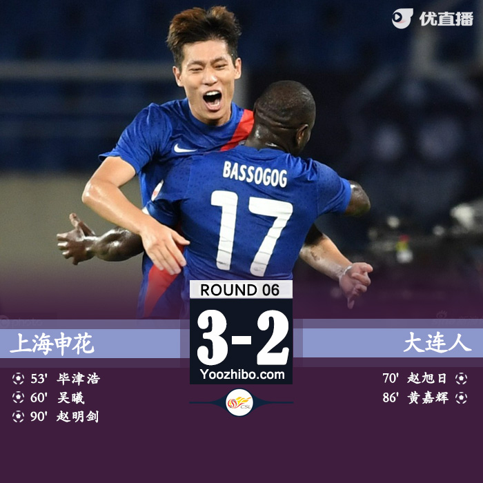 24直播网7月19日讯 北京时间7月19日18:30,中超第6轮,上海申花对阵大连人。上半场,两队整体节奏较慢,陶强龙开场远射造险,曹赟定伤退;下半场,巴索戈助攻毕津浩头球破门,吴曦助申花2球领先,赵旭日扳回一城,黄嘉辉第87分钟扳平比分,赵明剑绝杀。最终,申花3-2击败大连人,收获近4轮首胜。