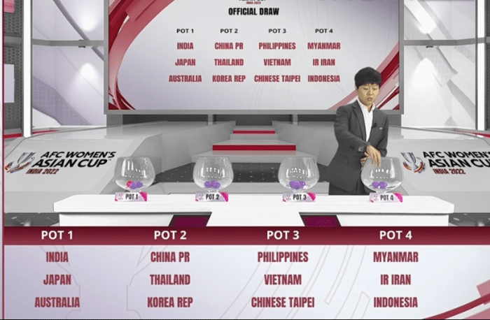 来源:24直播网10-28 15:4224直播网10月28日讯 ,2022女足亚洲杯分组抽签仪式举行,此前进行的女足亚洲杯的比赛已经决出了12强,12支晋级的球队分别是印度队,澳大利亚队,中国队,中国台北,印度尼西亚,伊朗队,日本队,韩国队,缅甸队,菲律宾队,泰国队,越南队,本次女足亚洲杯女足的比赛将会在印度举行。