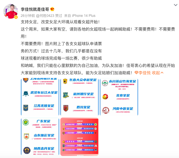 本周末中女超联赛正式重燃战火,为此效力于上海女足的李佳悦,也积极为中女超联赛应援,号召球迷走进球场观战。