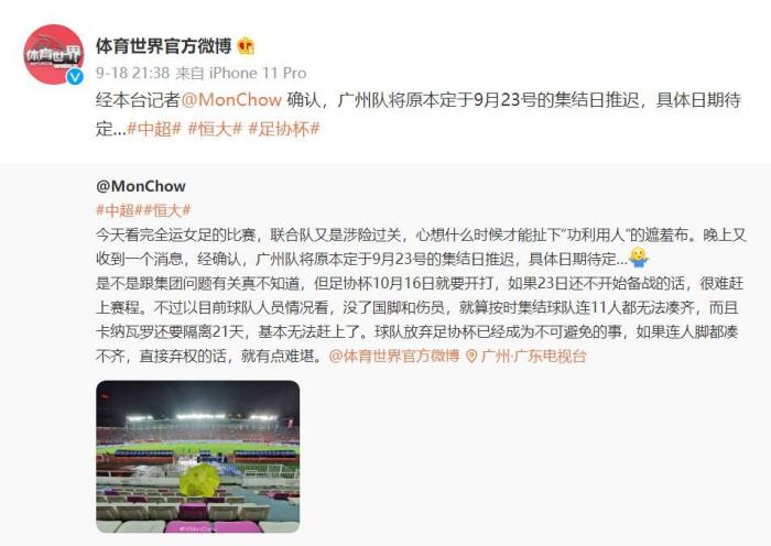 记者:广州队推迟集结日期,放弃足协杯已不可避免