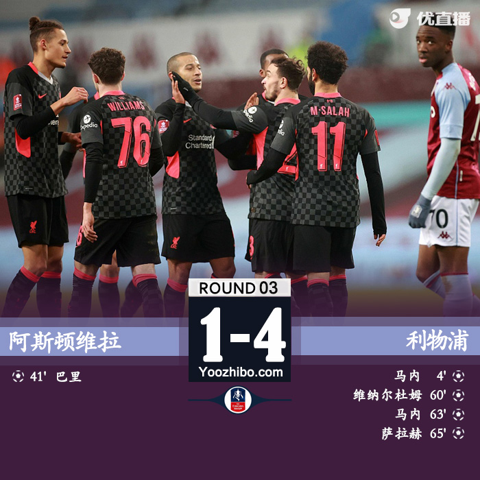 24直播网1月9日讯 北京时间1月9日03:45,英格兰足总杯第3轮展开争夺,利物浦客场挑战阿斯顿维拉。上半场,马内头球率先破门,巴里单刀球扳平比分。下半场,利物浦5分钟内由维纳尔杜姆,马内,萨拉赫连入3球锁定胜局,沙奇里替补两助攻。最终,利物浦4-1客场战胜青年队球员组成的维拉,顺利晋级32强。