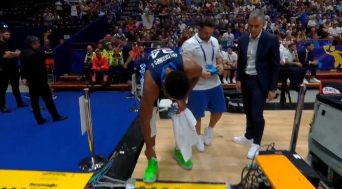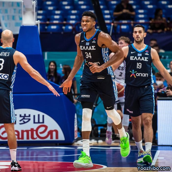 第三节,字母哥在一次进攻中撞倒对方的防守球员被吹了进攻犯规,不幸扭伤脚踝,随后他站在场边表情痛苦,被替换下场后字母哥捂着自己的脚踝,之后坐在替补席冰敷膝盖,因扭伤脚踝而退出本场比赛,全场出战19分钟,10投9中高效轰下25分,字母哥伤退,希腊仍21分大胜爱沙尼亚。