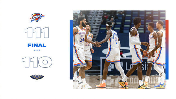 24直播网1月7日讯 NBA常规赛雷霆对阵鹈鹕,两队上场比赛都遭遇失利。开场后雷霆外线连中三分,不过锡安和亚当斯优势明显帮助鹈鹕取得领先,随后鹈鹕外线也打开局面,第二节两队先后打出攻势,上半场结束,鹈鹕59-54继续领先雷霆。下半场回来贝兹利独得11分帮助雷霆反超,虽然锡安和英格拉姆轮番为鹈鹕追分,不过亚历山大也状态神勇为雷霆保持优势,最后一节锡安和亚当斯利用内线优势帮助鹈鹕一度夺回领先,不过乔治-希尔最后造到犯规两罚全中,鹈鹕绝杀未果,最终雷霆111-110险胜鹈鹕。