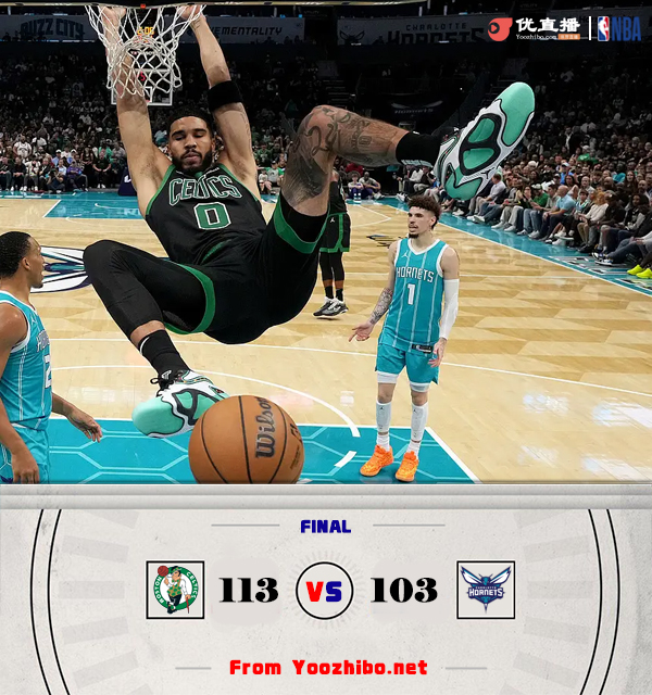 24直播网11月3日讯 NBA常规赛,黄蜂主场再战凯尔特人,昨天两队刚在夏洛特进行了一场比赛,绿军15分优势战胜黄蜂,且中途格威对塔图姆恶意犯规被驱逐出场,本场比赛杰伦-布朗因伤缺阵。比赛开始,怀特接连三分,绿军上来进攻端如潮水般迅速建立双位数领先,三球上来被针对连续失误和犯规,好在曼恩上来里突外投止血,但首节凯尔特人领先14分,次节绿军继续发力拉大领先,普理查德接连3记三分拉开20分以上领先,三球终于苏醒里突外投连砍15分止血,半场绿军依然领先18分。下半场,黄蜂外线多点开户连中5记三分,一波17-2超级攻击波直接追到差3分,绿军继续依靠外线三分回应止血,三节绿军继续领先11分,末节双方围绕着10分左右分差展开拉锯战,黄蜂追分绿军总能回应,最终凯尔特人113-103再胜黄蜂。