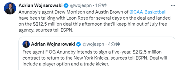 来源:24直播网06-27 12:0324直播网讯 北京时间6月27日,据ESPN名记Woj报道,自由球员前锋OG-阿努诺比将以5年2.125亿美元的合同重返尼克斯,这份合同包括球员选项和交易否决权,双方已经达成协议,这将使阿努诺比无法在7月份成为自由球员。