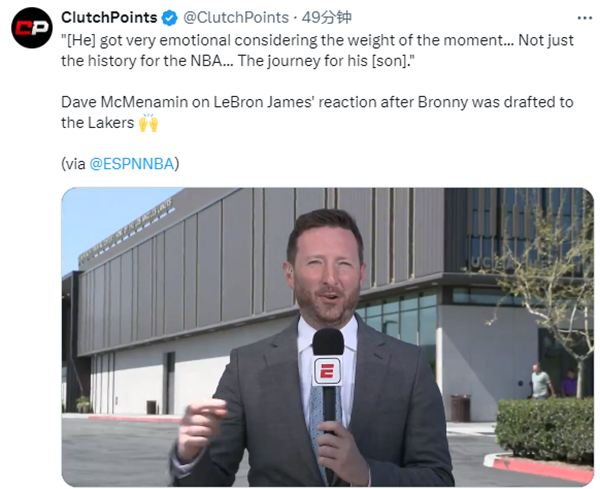 詹姆斯全家狂欢庆祝也曝光了——布朗尼被湖人选中后,詹姆斯的亲朋好友都鼓掌以及欢呼庆祝,老詹激动大喊;布朗尼情绪激动并且动情落泪,萨瓦娜把湖人帽子递给布朗尼,她擦拭眼泪也哭了。