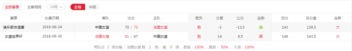 翻看一下中国女篮和法国女篮最近的交手情况,还要追溯到2019年6月24日的俱乐部友谊赛,中国女篮70-73不敌法国女篮,输掉了这一场热身赛,3分之差确实很可惜。此外,2018年9月30日女篮世界杯,中国女篮同样和法国女篮交手,不过这是一场排位赛,但中国女篮还是以67-81惨败法国女篮,仅拿到2018年女篮世界杯的第6名。