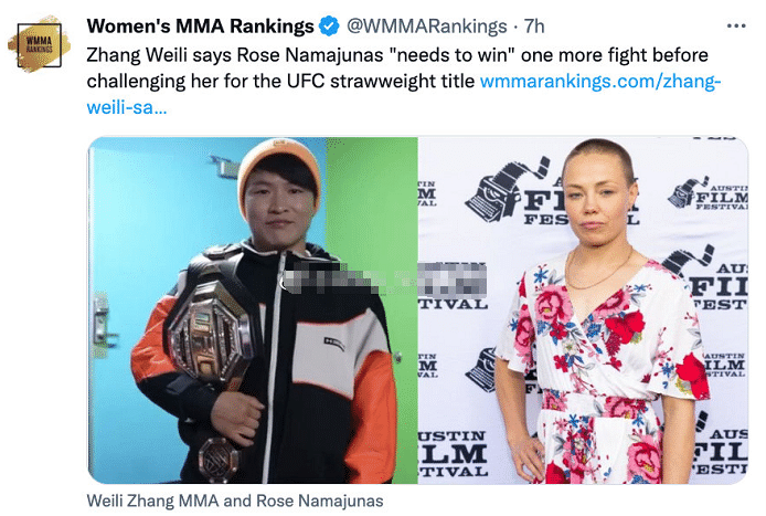 接你“玛格南”张伟丽在《The MMA Hour》节目上被问到是否愿意与“暴徒玫瑰”罗斯-娜玛朱纳斯争夺冠军头衔。张伟丽霸气回应:肯定会有3番战,但下一场不会打她,前提她得有冠军挑战权。